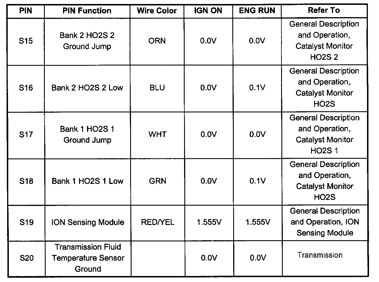PCM Pinout Table, 80 - Way Red Connector - Row "S1 - 20" (S15 To S20):
