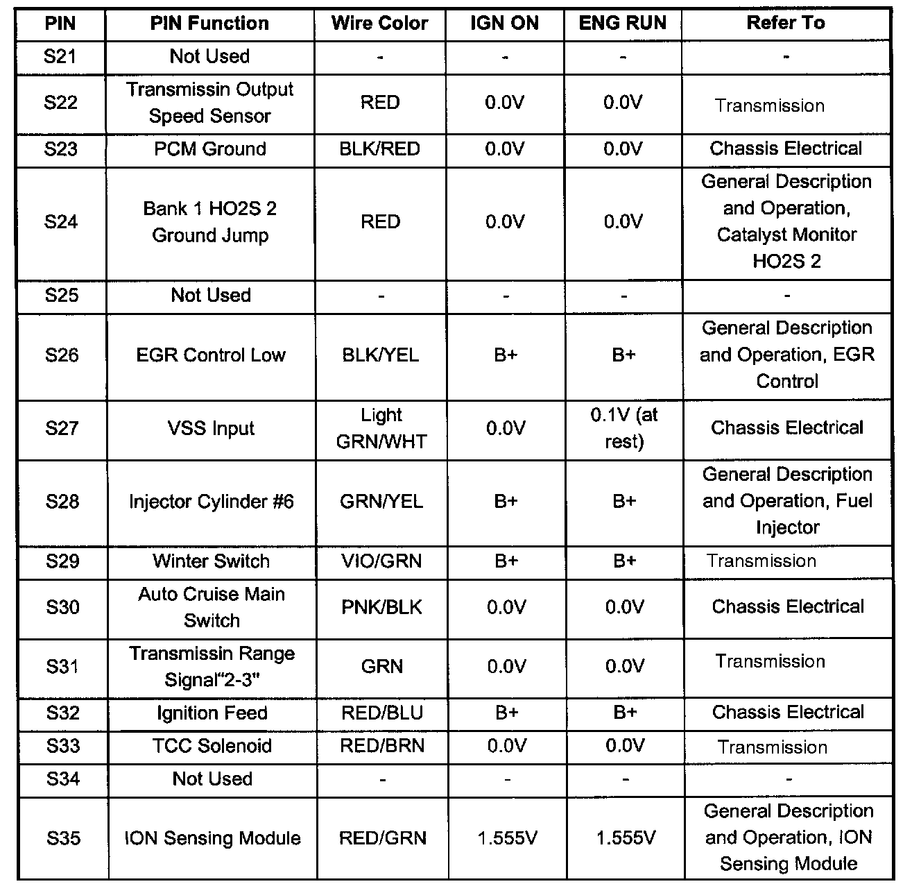 PCM Pinout Table, 80 - Way Red Connector - Row "S21 - 40" (S21 To S35):