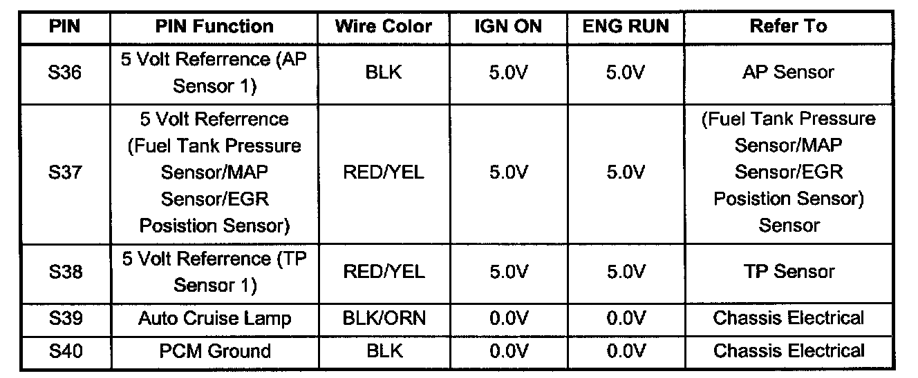 PCM Pinout Table, 80 - Way Red Connector - Row "S21 - 40" (S36 To S40):