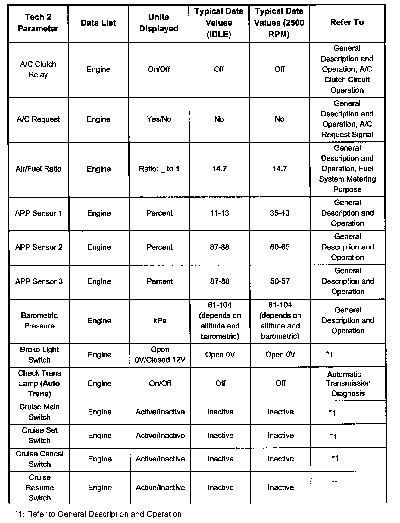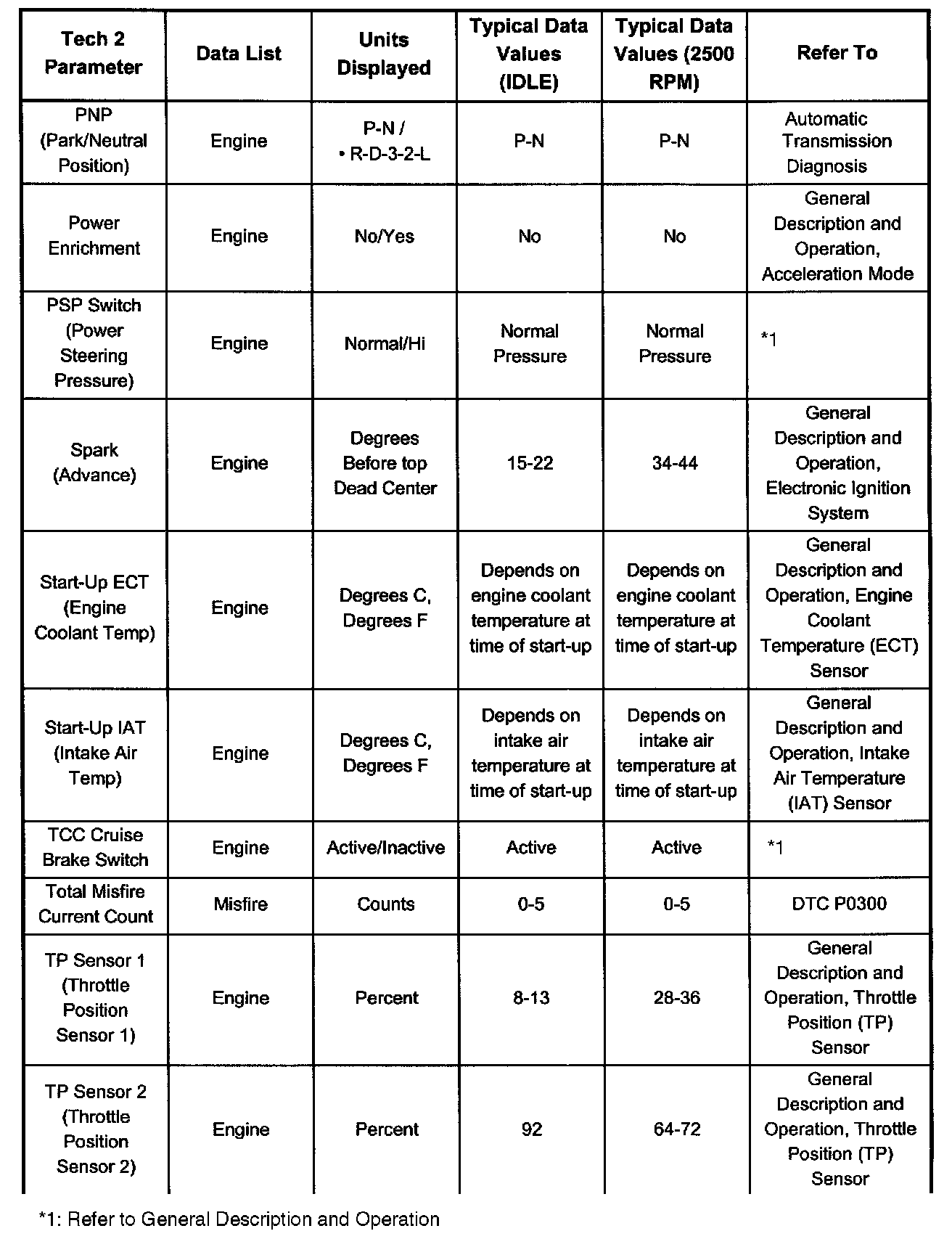 Only the parameters listed are referred for use in diagnosis. For further information on using the Tech 2 to diagnose the PCM and related sensors, refer to the applicable reference listed below. If all values are within the typical range described below, refer to Symptom Diagnosis for diagnosis.
