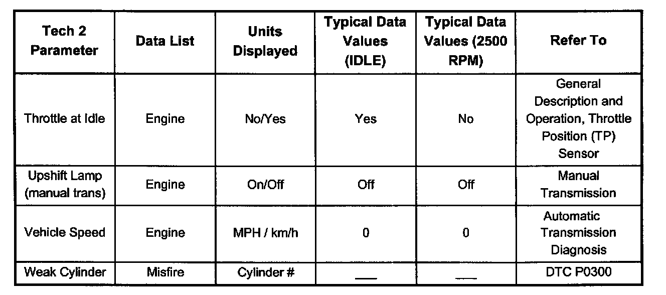 Use the Typical Scan Data Values Table only after the On-Board Diagnostic System Check has been completed, no DTC(s) were noted, and you have determined that the on-board diagnostics are functioning properly. Tech 2 values from a properly-running engine may be used for comparison with the engine you are diagnosing. The typical scan data values represent values that would be seen on a normally-running engine.NOTE: A Tech 2 that displays faulty data should not be used, and the problem should be reported to the Tech 2 manufacturer. Use of a faulty Tech 2 can result in misdiagnosis and unnecessary replacement of parts.