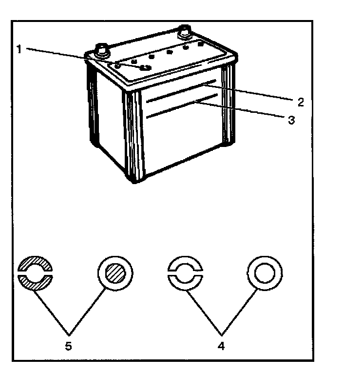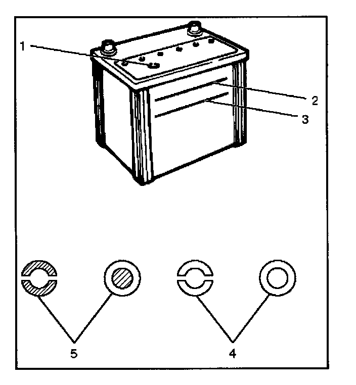 The fluid level should be between the upper level line (2) and lower level line (3) on side of battery.