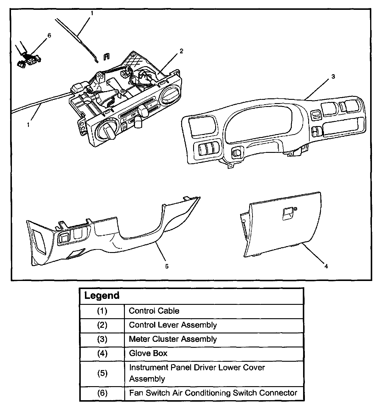6. Pull the control lever assembly out and disconnect the fan switch and air conditioning switch connectors.