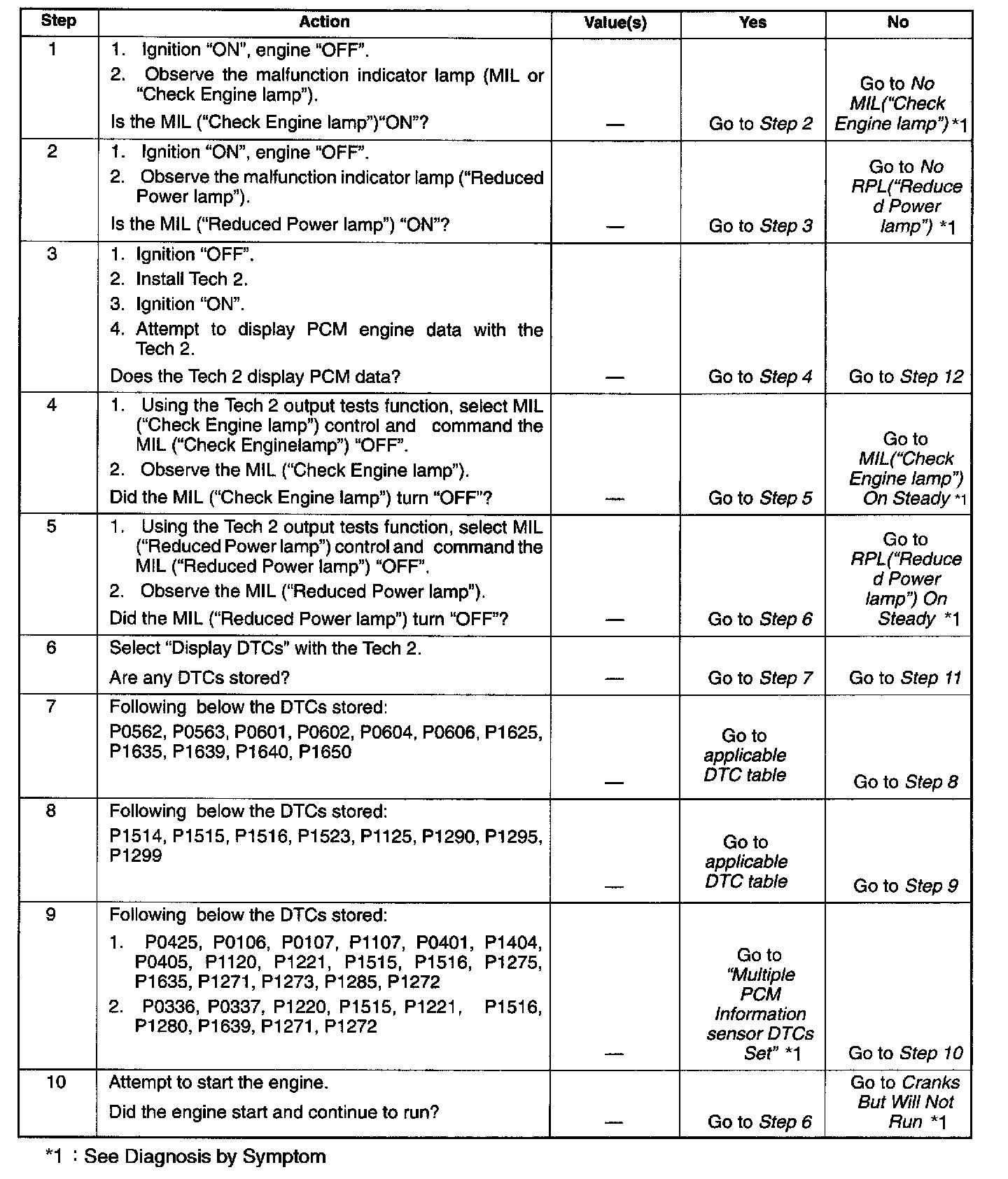 1. The MIL ("Check Engine lamp") should be "ON" steady with the ignition "ON" engine "OFF". If not, the "No MIL" chart should be used to isolate the malfunction.