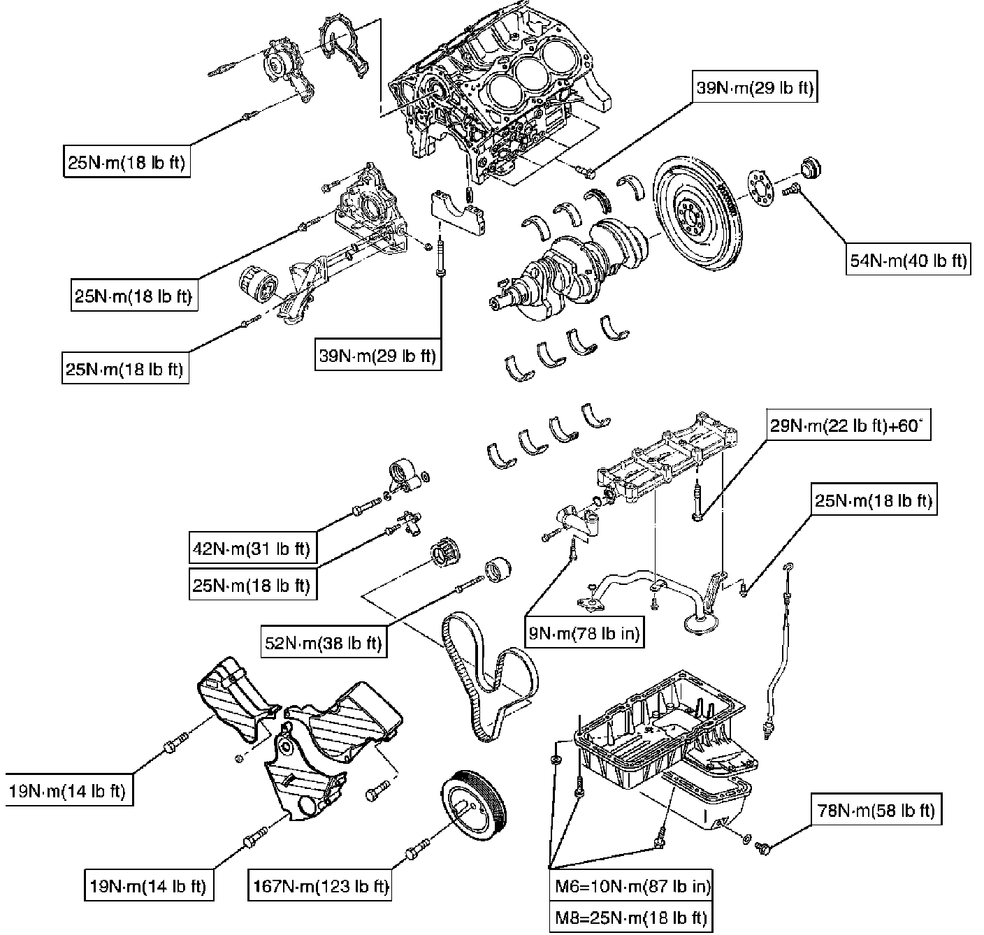 Crankshaft Main Bearing, Flywheel, Crankcase, Oil Pan, Timing Belt Tensioner, Timing Pulley, Timing Belt Cover, Oil Pump, Oil Gallery, Oil Strainer and Water Pump
