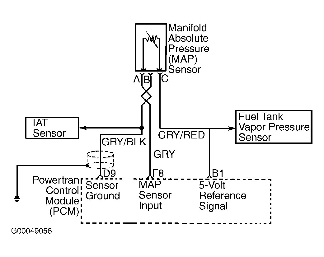 - Repair short to voltage in Gray wire between PCM harness connector terminal F8 and MAP sensor. See Figure and Figure .