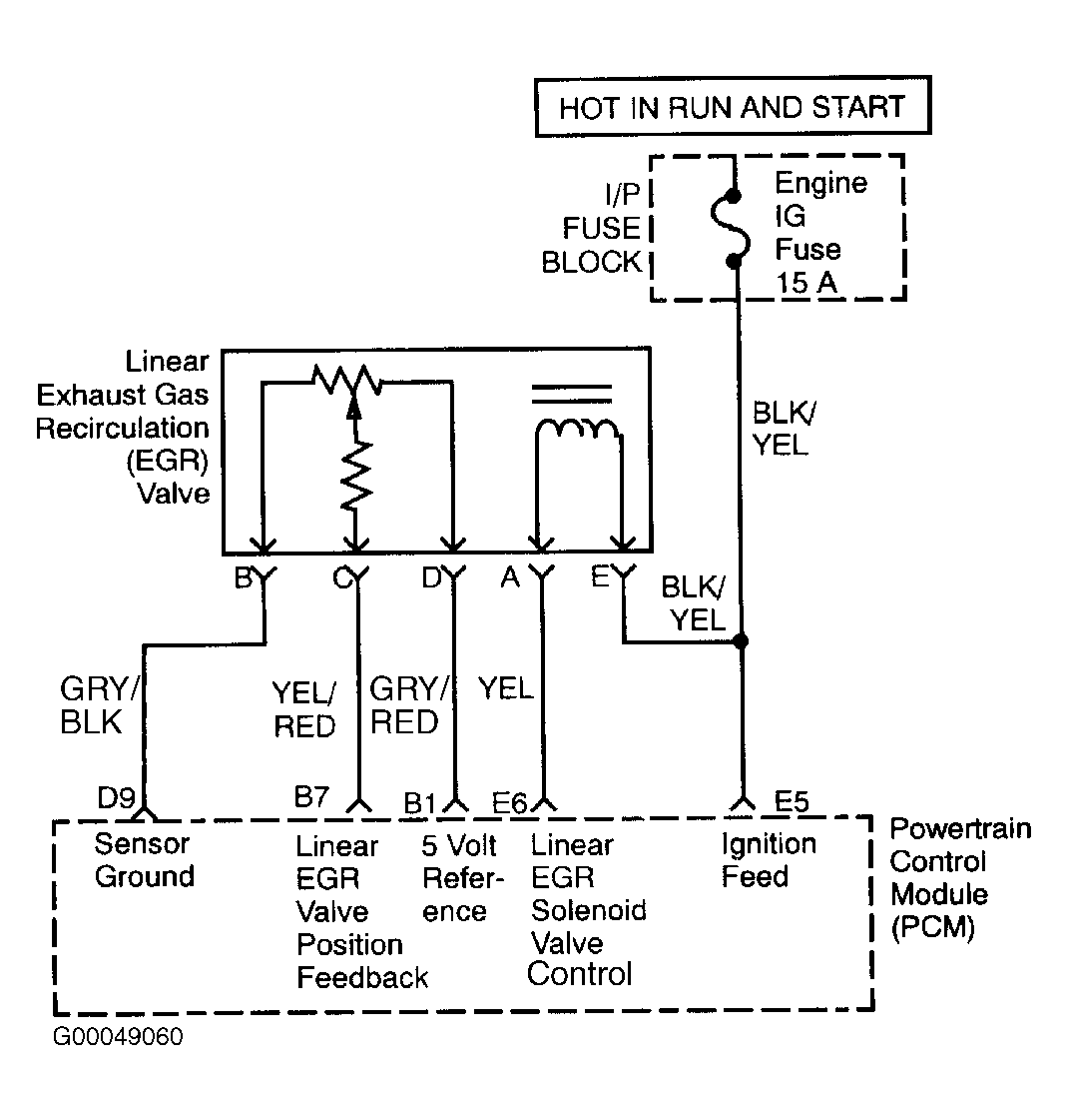 - Repair short to voltage in Yellow/Red wire between PCM harness connector terminal B7 and EGR valve. See Figure and Figure .