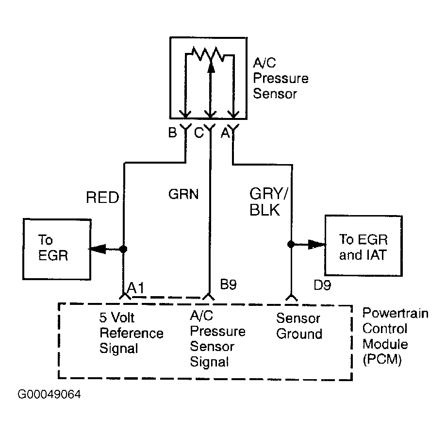 - Repair short to voltage in Green wire between PCM harness connector terminal B9 and A/C pressure sensor. See Figure and Figure .