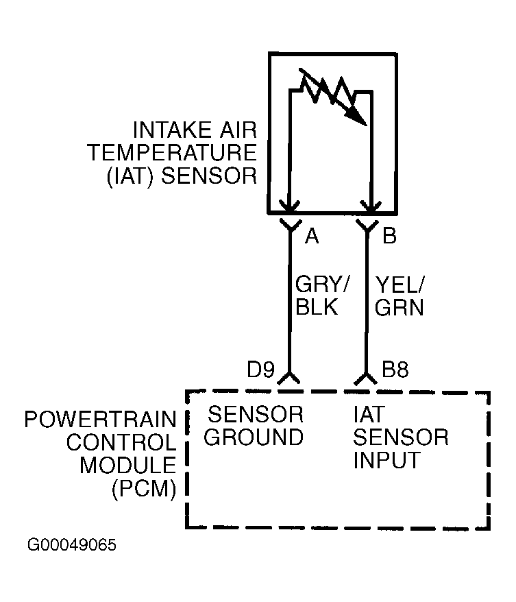 - Repair short to voltage in Yellow/Green wire between PCM harness connector terminal B8 and IAT sensor. See Figure and Figure .