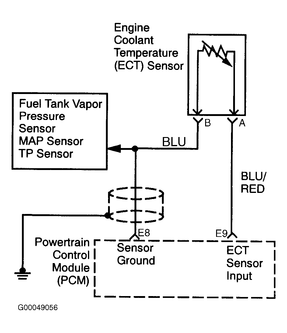 - Repair short to voltage in Blue/Red wire between PCM harness connector terminal E9 and ECT sensor. See Figure and Figure .