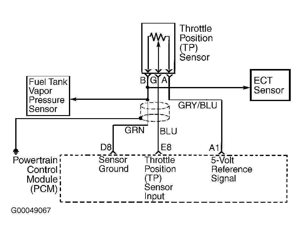 - Using DVOM, check voltage between ground and TP sensor signal circuit at PCM harness connector terminal E8 (Blue wire). See Figure . If no voltage exists, go to next step. If voltage exists, go to step 15 .