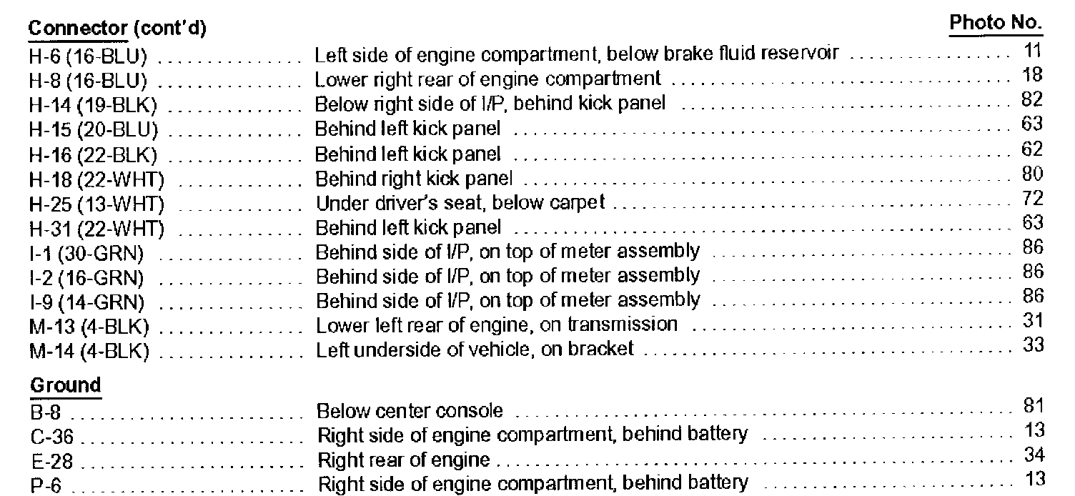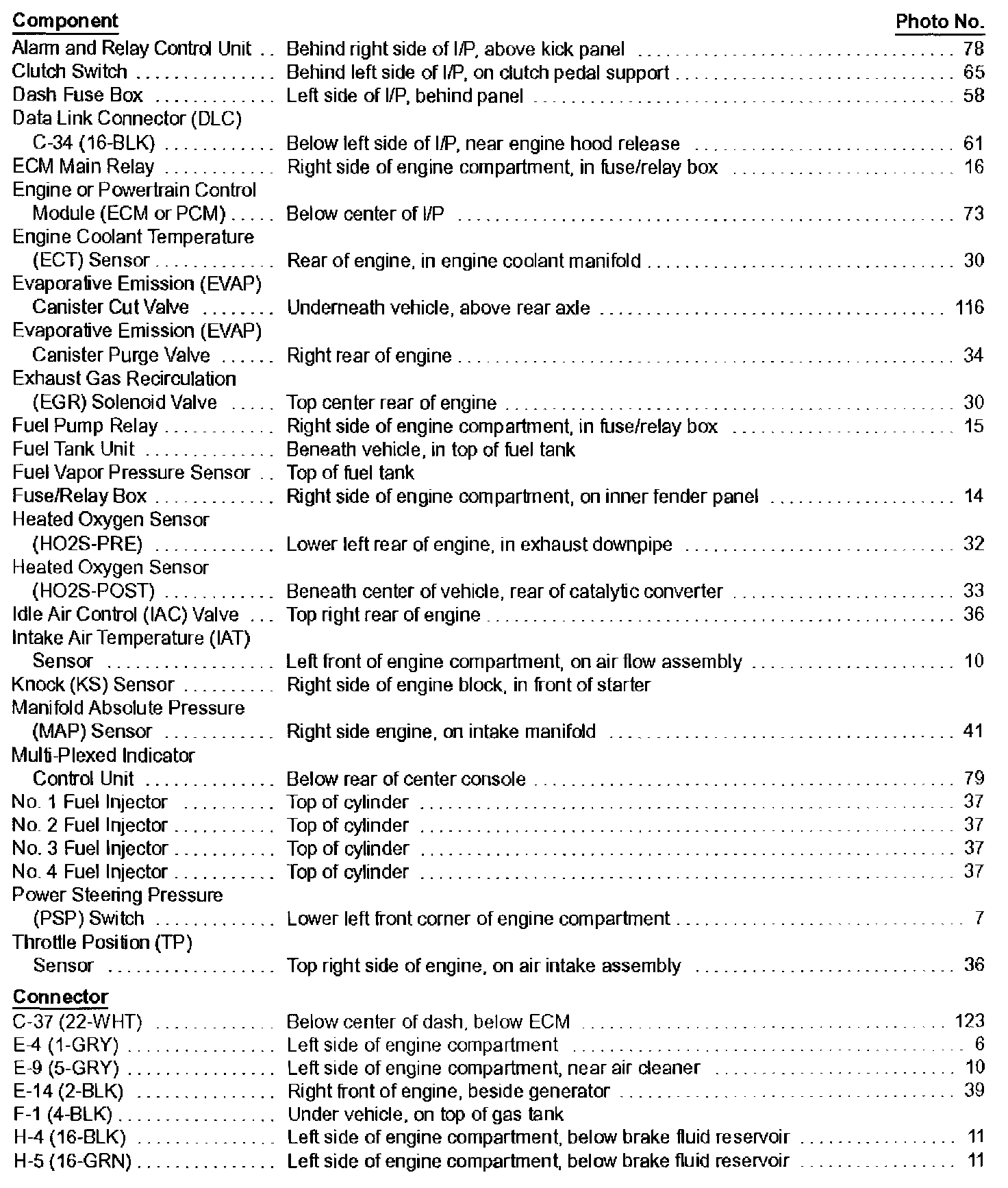 Engine Component Locator Table: