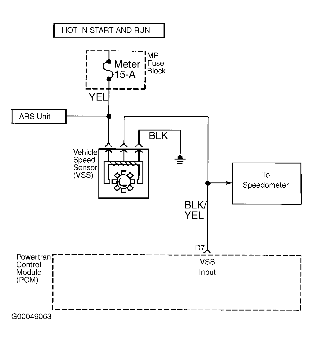 - Turn ignition off. Disconnect PCM harness connectors. Using a DVOM, check continuity of Black/Yellow wire between PCM harness connector terminal D7 and VSS harness connector. See Figure