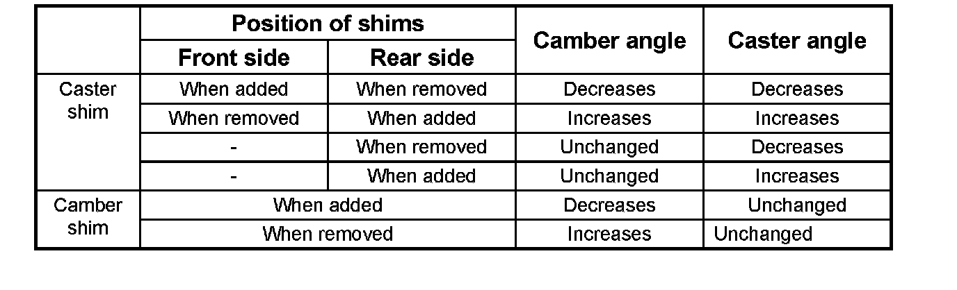 Note: Difference of the caster shim front/rear thickness should be 3.6 mm (0. 142 inch) or less. Overall thickness of caster shim and camber shim should be 10.8 mm (0.425 inch) or less.