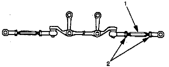 1. To adjust the toe-in angle, loosen the lock nuts (2) on the outer track rods (1) and turn the outer track rods. Turn both rods the same amount, to keep the steering wheel centered.