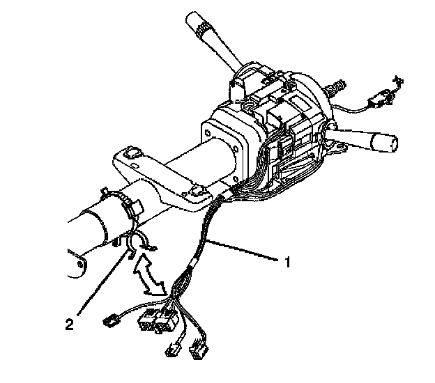 3. Remove the wire harness strap (2) from the steering column and the wire harness assembly (1).