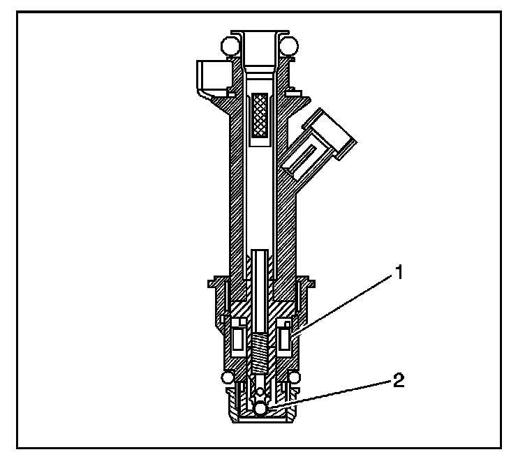 The Multec 2 fuel injector assembly is a solenoid device controlled by the control module that meters pressurized fuel to a single engine cylinder. The control module energizes the high-impedance, 12 ohms, injector solenoid (2) to open a normally closed ball valve (3). This allows fuel to flow into the top of the injector, past the ball valve, and through a director plate at the injector outlet. The director plate has four machined holes that control the fuel flow, generating a spray of finely atomized fuel at the injector tip. Fuel from the injector tip is directed at the intake valve, causing the fuel to become further atomized and vaporized before entering the combustion chamber. This fine atomization improves fuel economy and emissions.