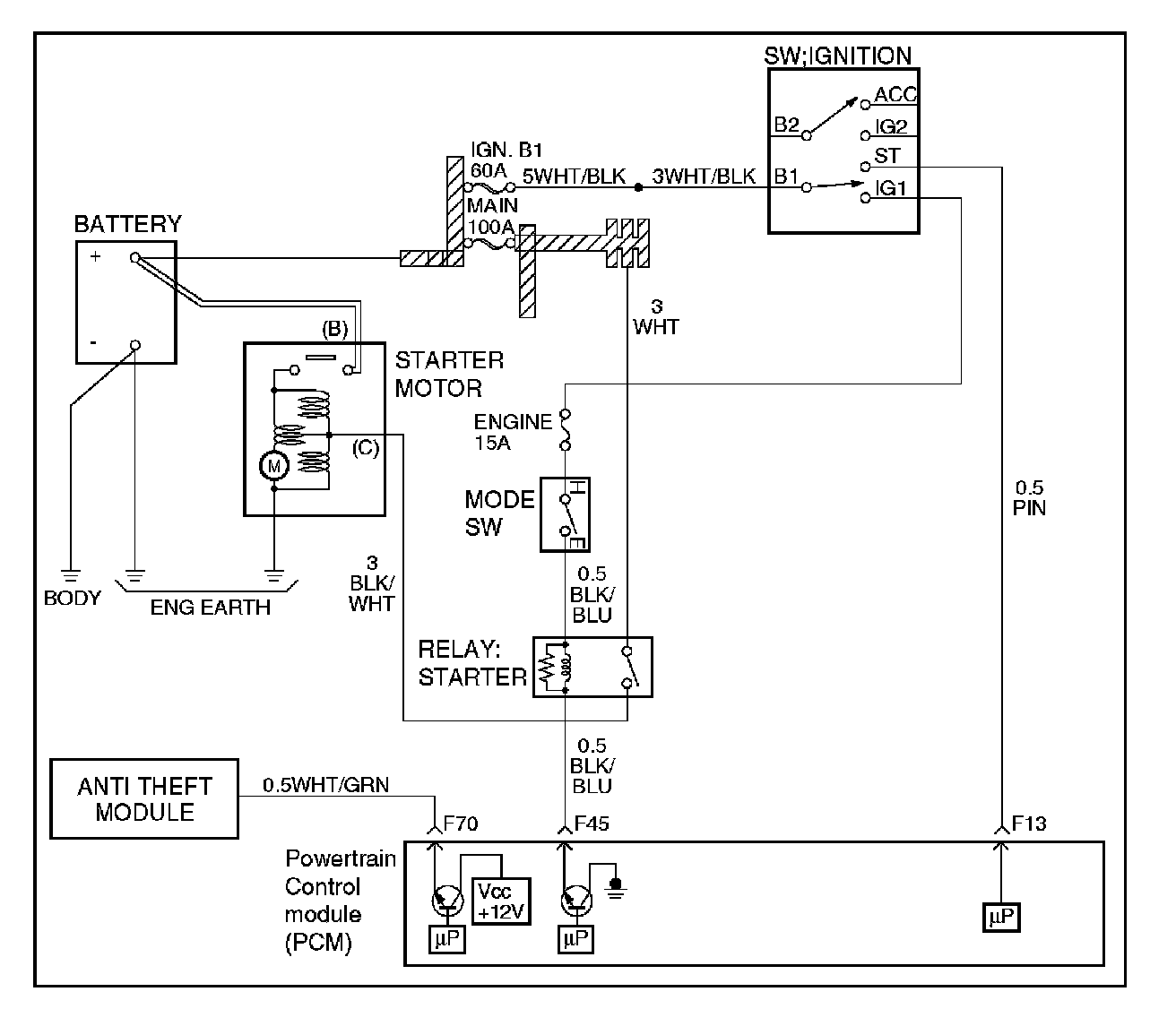Starter control system is controlled by the Power Train Control Module (PCM). The PCM monitors starter switch signal ("START"position ) and MODE switch (park or neutral) signal. PCM is operated by the ignition switch.