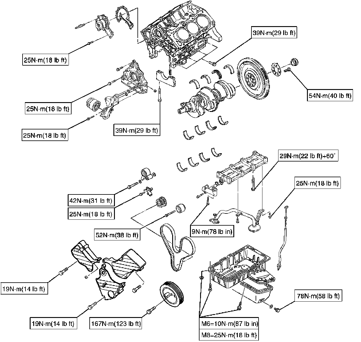 Crankshaft main bearing, Flywheel, Crankcase, Oil pan, Timing belt tensioner, Timing pulley, Timing belt cover, Oil pump, Oil gallery, Oil strainer and water pump
