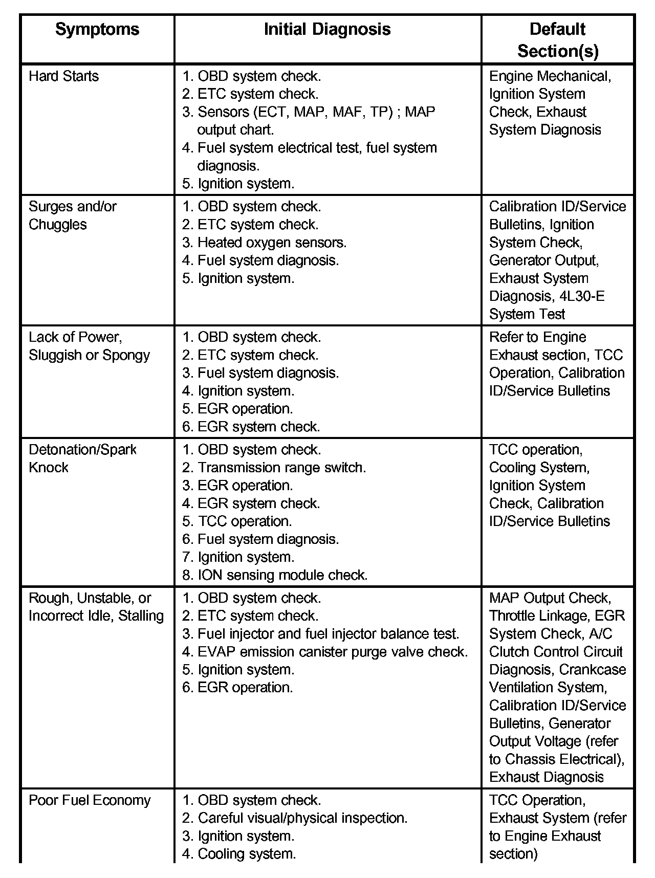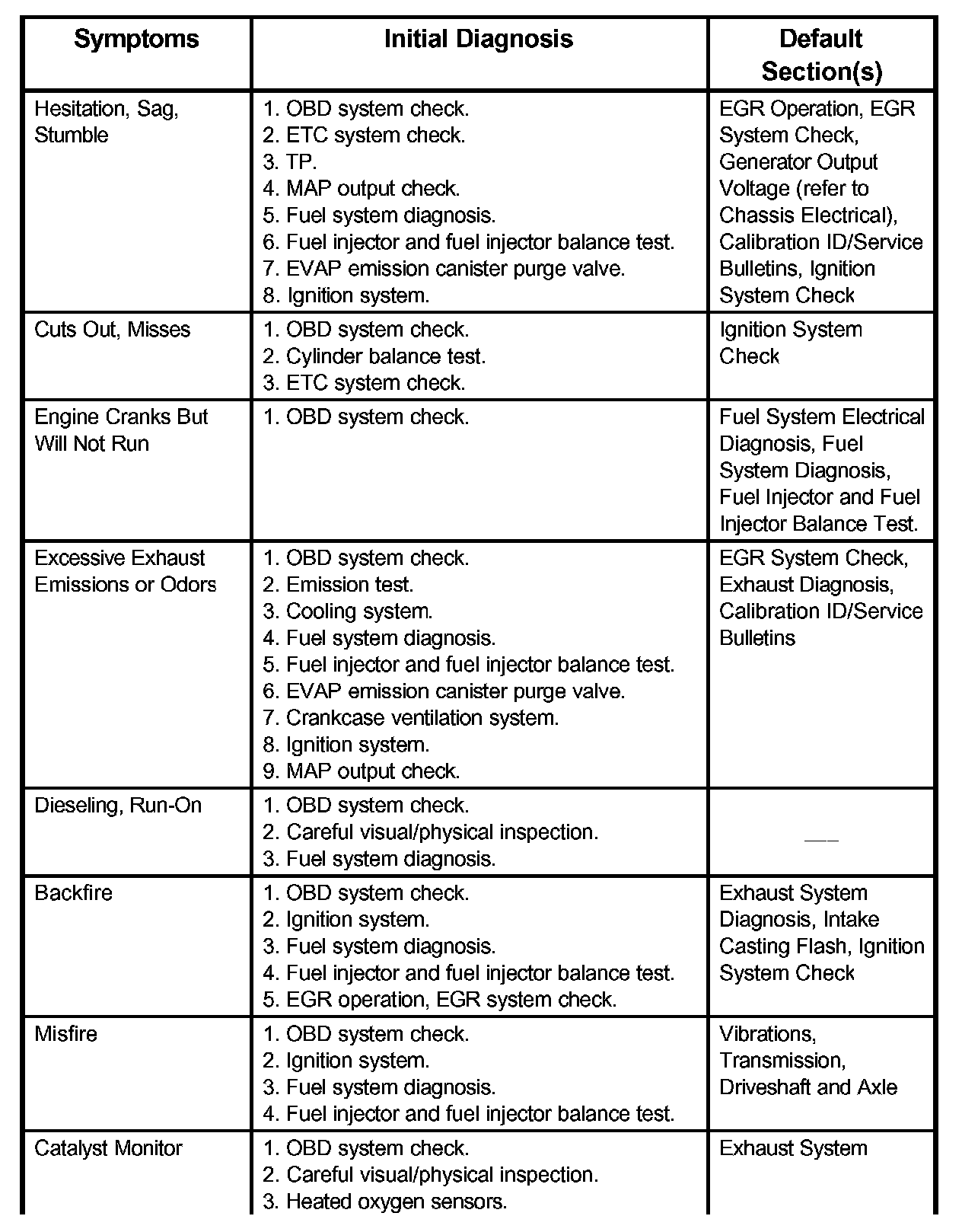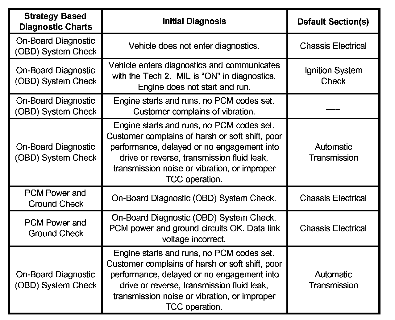 Service Procedure Default StrategyA referral strategy has been established to assist the technician with additional information when the cause of the failure cannot be determined. If no problem is found after performing diagnostics, then refer to the default matrix table for further diagnostic information.