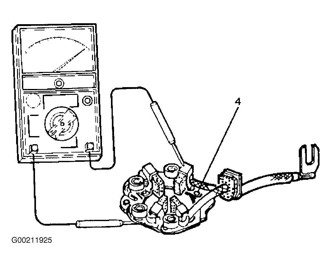 Check for continuity between brush holder (+) (4) and base (-). Replace, if there is continuity. See Fig 1.