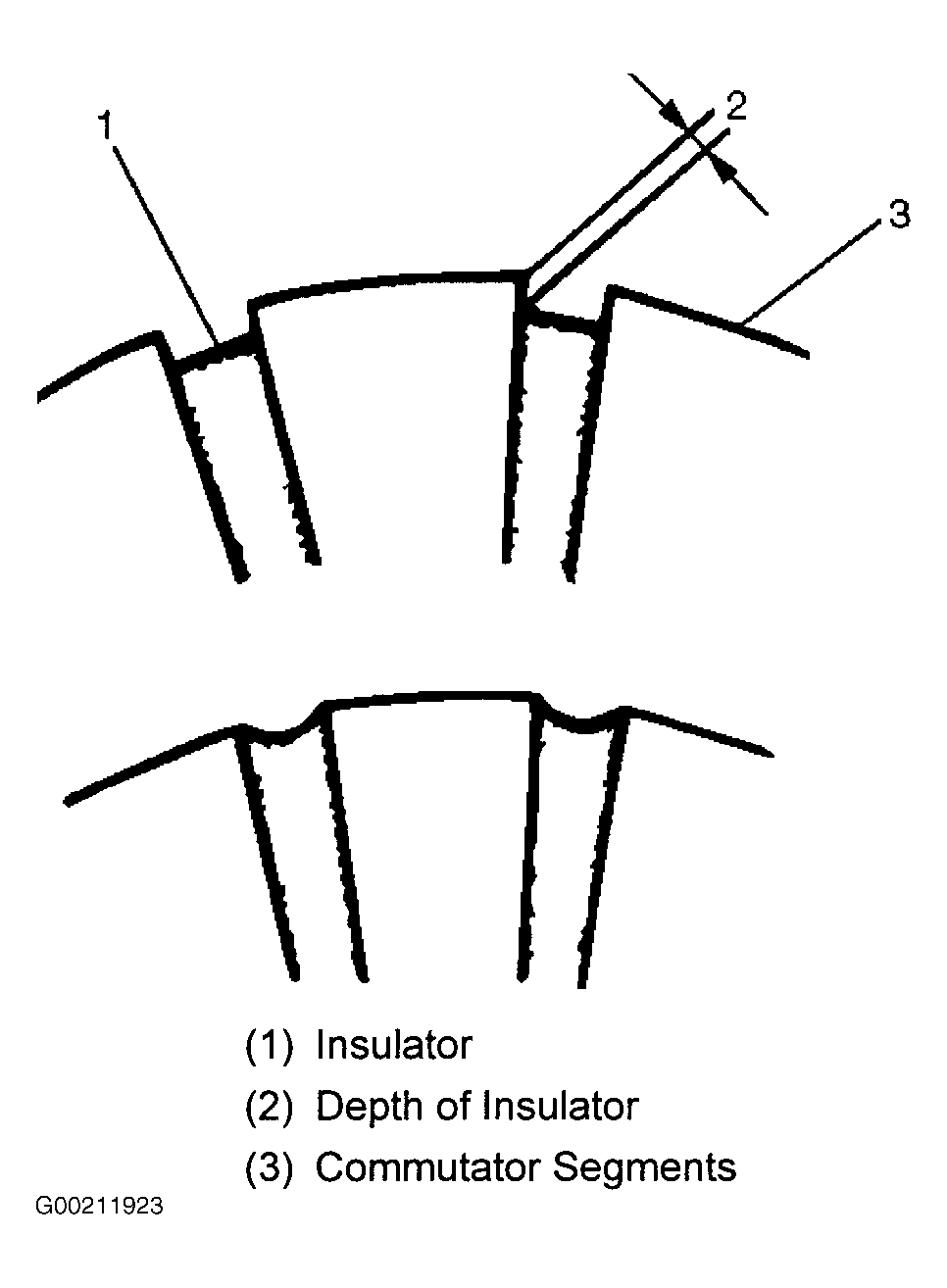 6. Measure the depth of insulator in commutator. Replace, if it is below the limit. See Fig 6. See STARTER SPECIFICATIONS .
