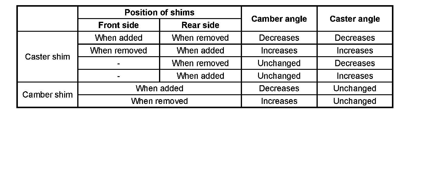 Note: Difference of the caster shim front/rear thickness should be 3.6 mm (0.142 inch) or less. Overall thickness of caster shim and camber shim should be 10.8 mm (0.425 inch) or less.