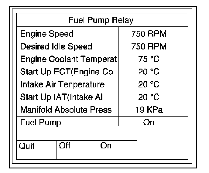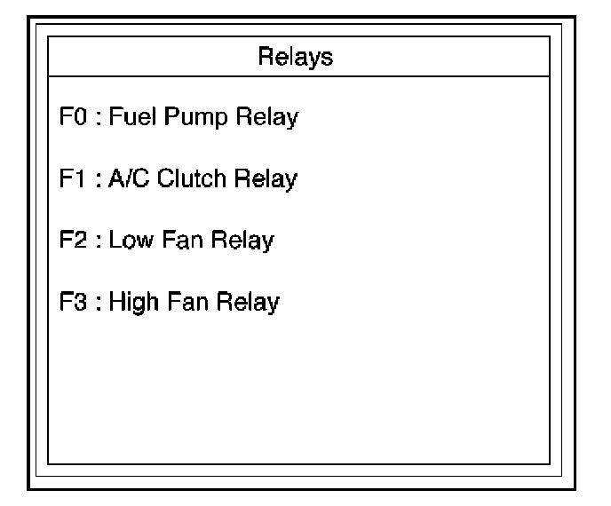 This test is conducted to check Fuel Pump Relay, A/C Clutch Low Fan and High Fan for proper operation.Tech 2 must be used for this test.