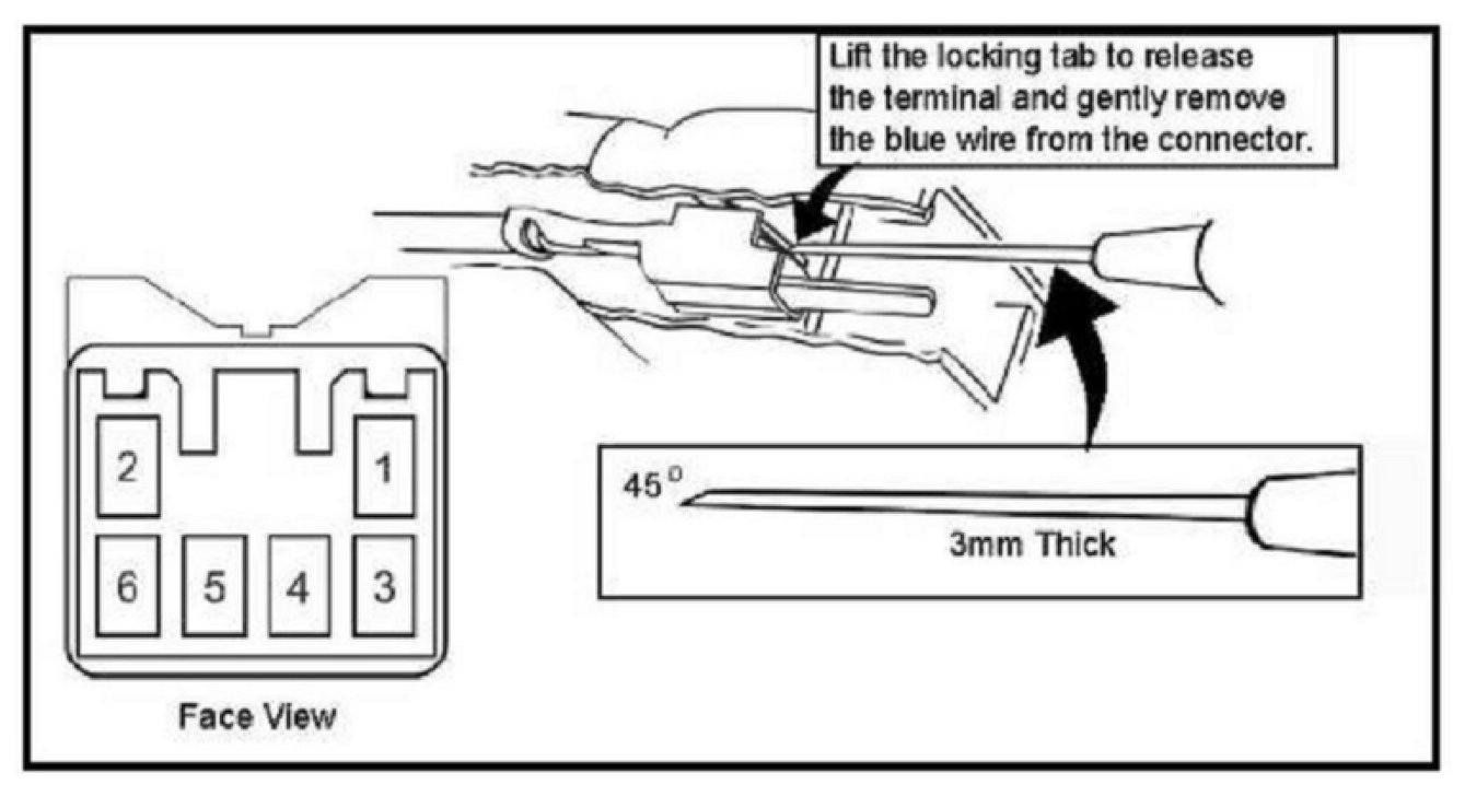 4. Disconnect the 1-40 (Rodeo) or 1-3 (Axiom) six-pin connector and slide the female connector off bracket. Remove the Terminal Position Assurance (TPA) Lock from the connector. Locate the two blue wires in position 1 and 3 on the female connector. With appropriate tool (shown above), apply light pressure upward on the connector locking tab while gently pulling on the blue wire to release.