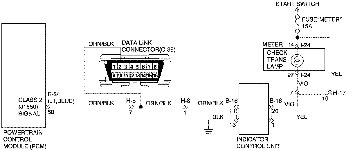 4. Verify that the instrument panel terminal 14 of connector 1-24 is connected to battery. If not, check the fuses and the connections (terminal 7 of connector H-17) voltage. If problem solved: GO TO CHECK TRANS INDICATOR.