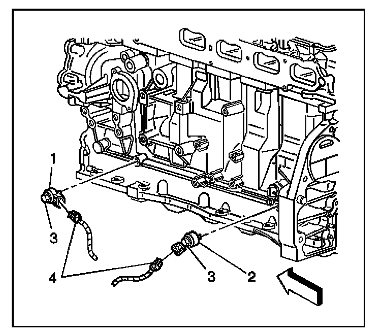 1. Install the knock sensor (1 or 2) and the bolt (3).
