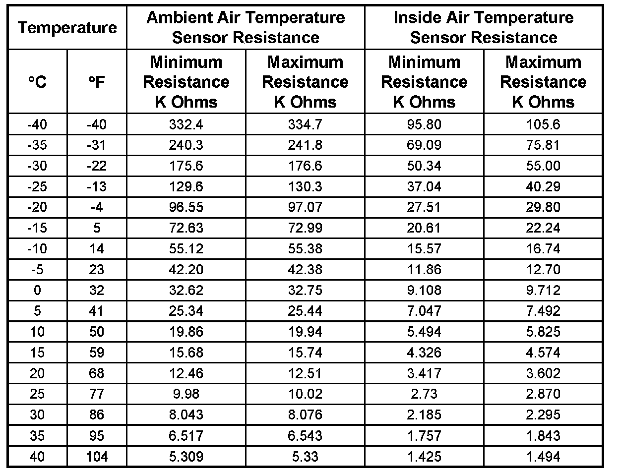 Sensor Resistance Table (Automatic):