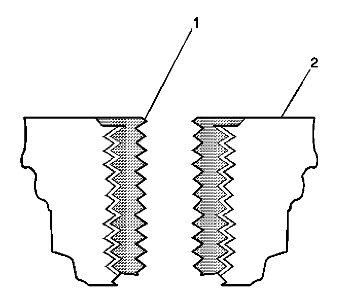A properly installed insert (1) will be either flush or slightly below flush with the surface of the base material (2).