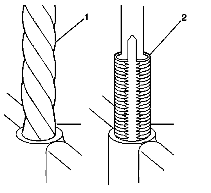 1. Drill out the threads of the damaged hole (1).