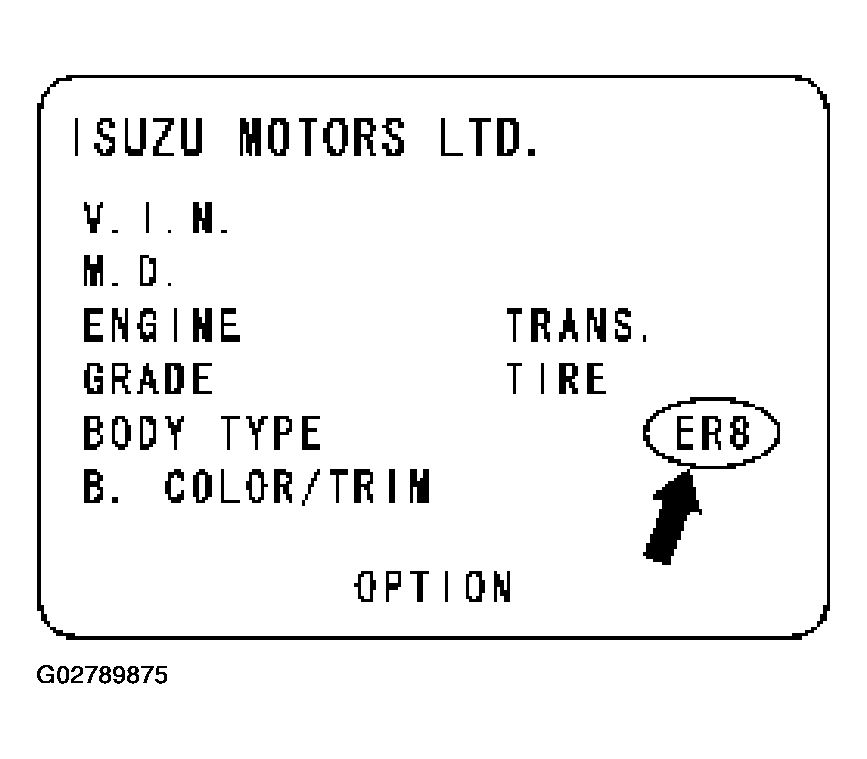 Destination code can be read from ID Plate affixed on vehicles, while on VIN plate the destination code is described at the right-hand edge of Body Type line. In Fig 1 , the destination code can be read as "ER8" (USA).