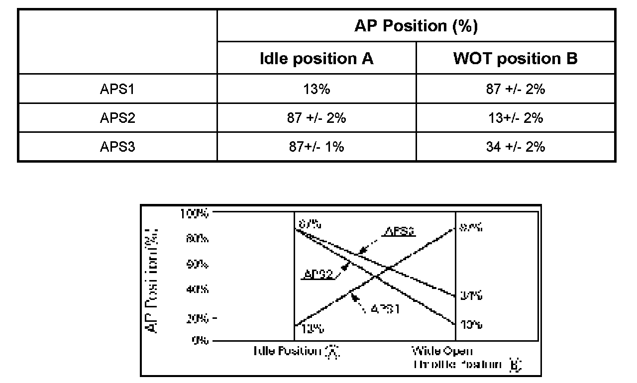 AP sensor is controlled three multiple control system, and adjust the idle position and WOT position are between A and B for AP sensor 1, AP sensor 2, and AP sensor 3. Refer to "How to adjust for AP sensor".