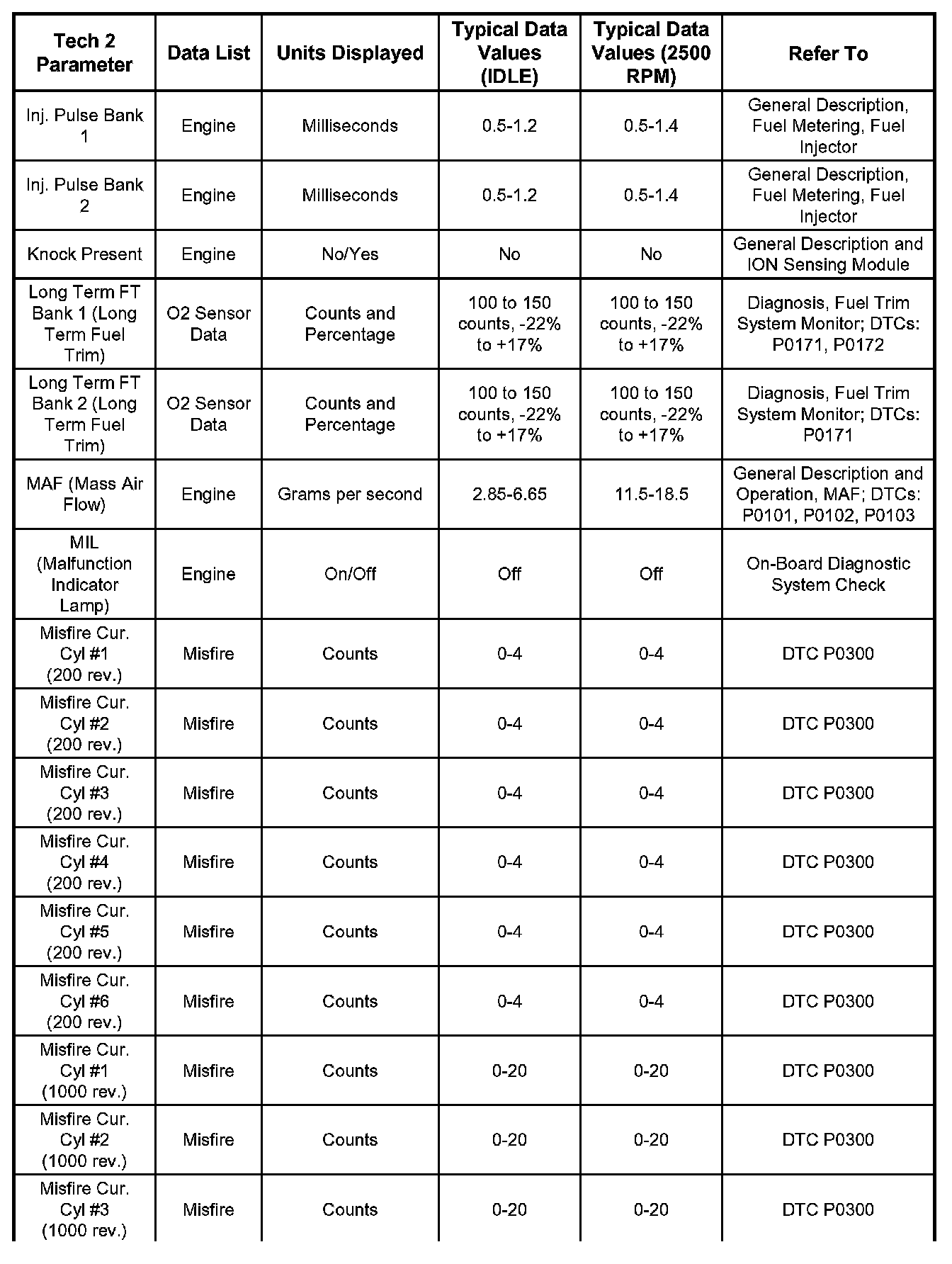 Typical Scan Data ValuesUse the Typical Scan Data Values Table only after the On-Board Diagnostic System Check has been completed, no DTC(s) were noted, and you have determined that the on-board diagnostics are functioning properly. Tech 2 values from a properly-running engine may be used for comparison with the engine you are diagnosing. The typical scan data values represent values that would be seen on a normally-running engine.