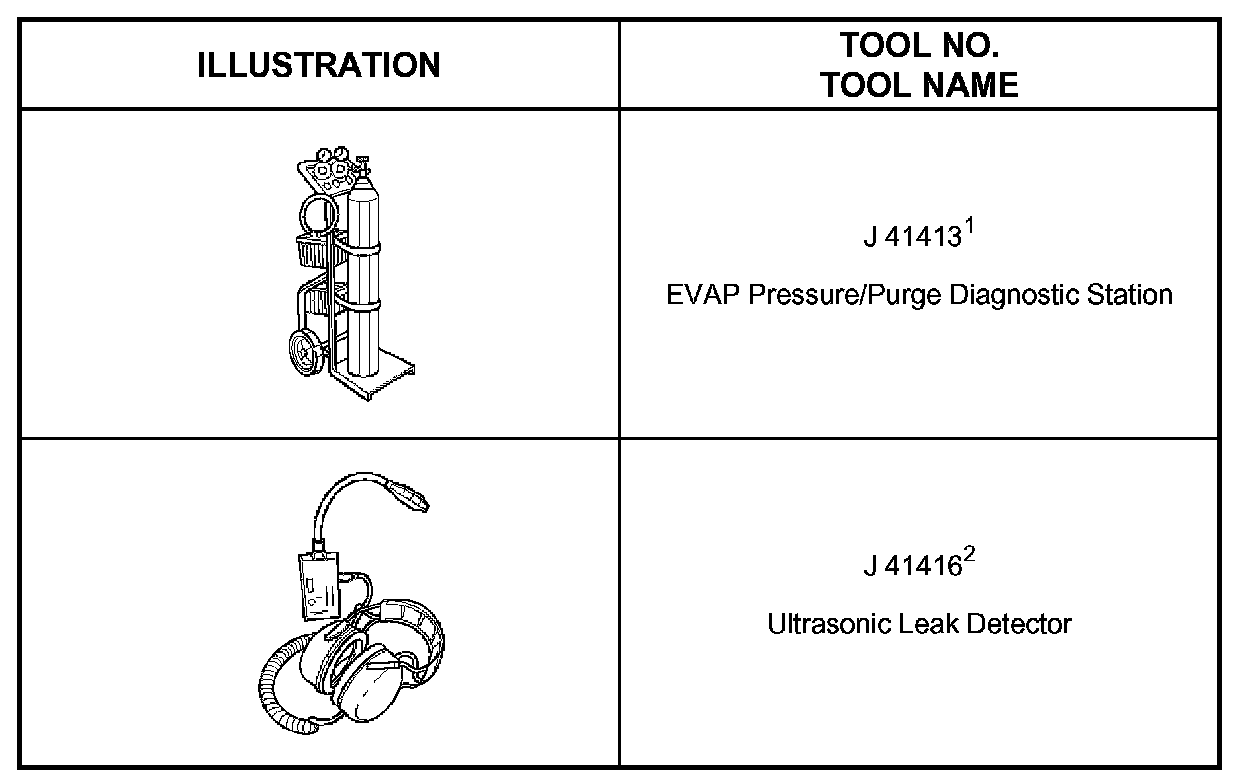 1. J 41413 EVAP Pressure/Purge Diagnostic Station is a multipurpose tool which is used to perform several diagnostic procedures for enhanced emission testing. The station will accommodate a nitrogen gas filled cylinder which is used to pressurize the vehicle EVAP system for a leakdown test and leak location test when a vehicle is repaired for leakage in the enhanced evaporative emission control system. It also has two additional gauges (inches of mercury and inches of water) which are used to measure both source vacuum and EVAP canister purge vacuum to verify correct operation and vapor flow within the canister purge circuit.