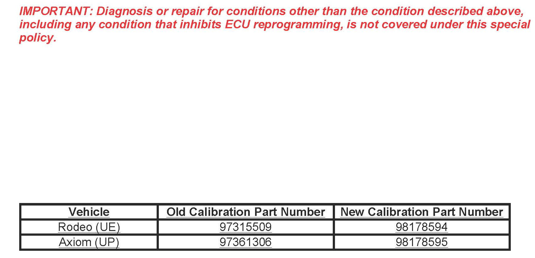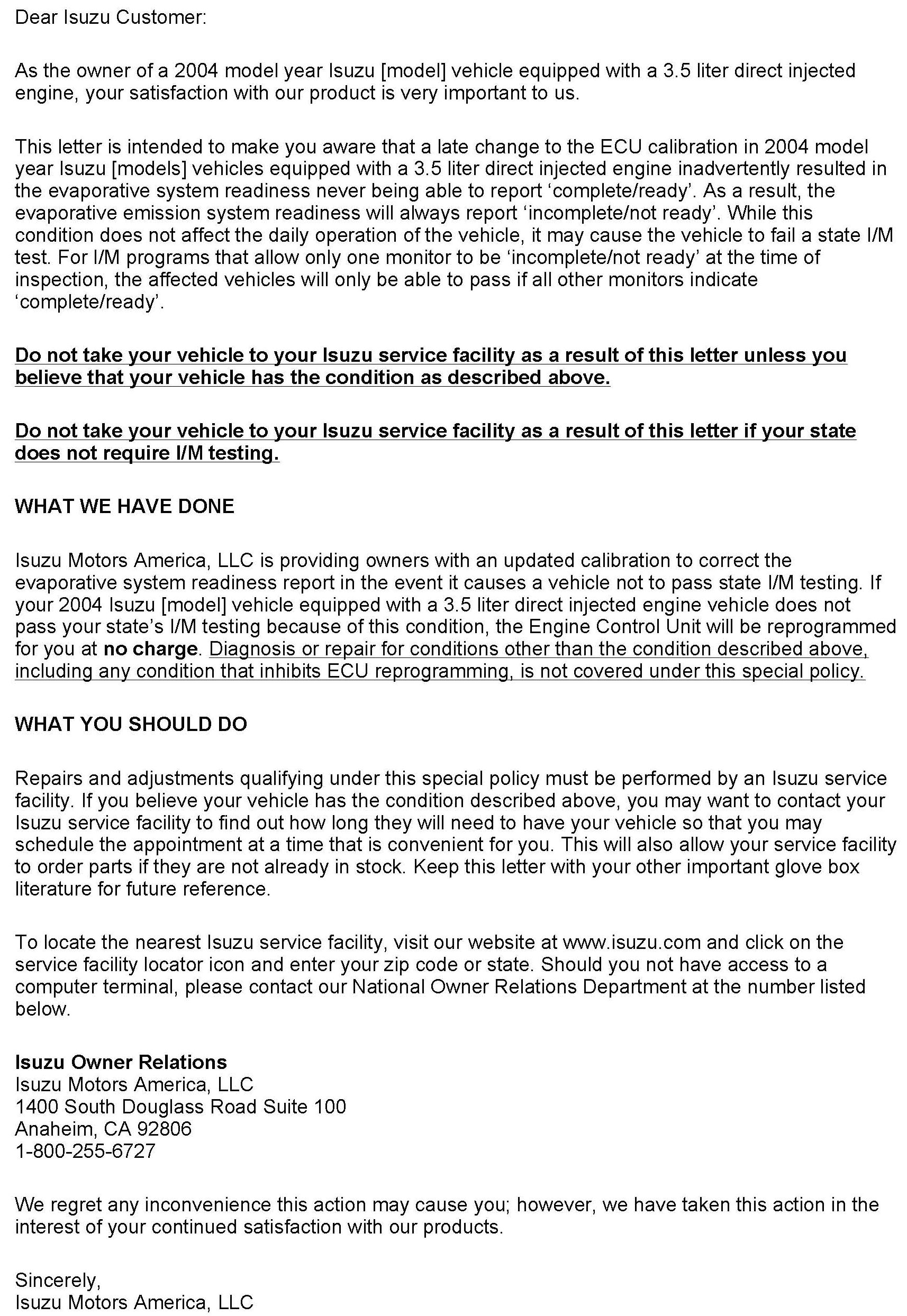 Isuzu Motors America LLC will notify customers of this special policy on their vehicles (See copy of typical letter included with this bulletin).