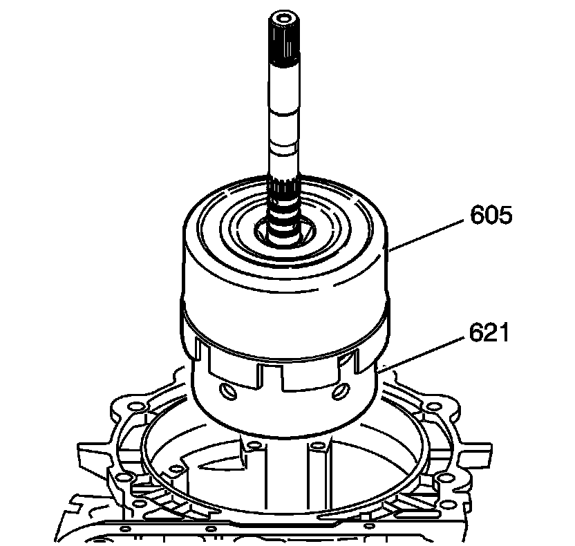 2. Remove the input housing and shaft assembly (621), along with the reverse input clutch housing and drum assembly (605).