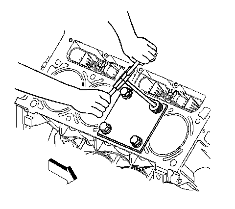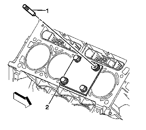 2. Install the fixture plate (3), bolts (1), and bushing (2) onto the engine block deck.Position the fixture plate and bushing over the hole that is to be repaired (4).