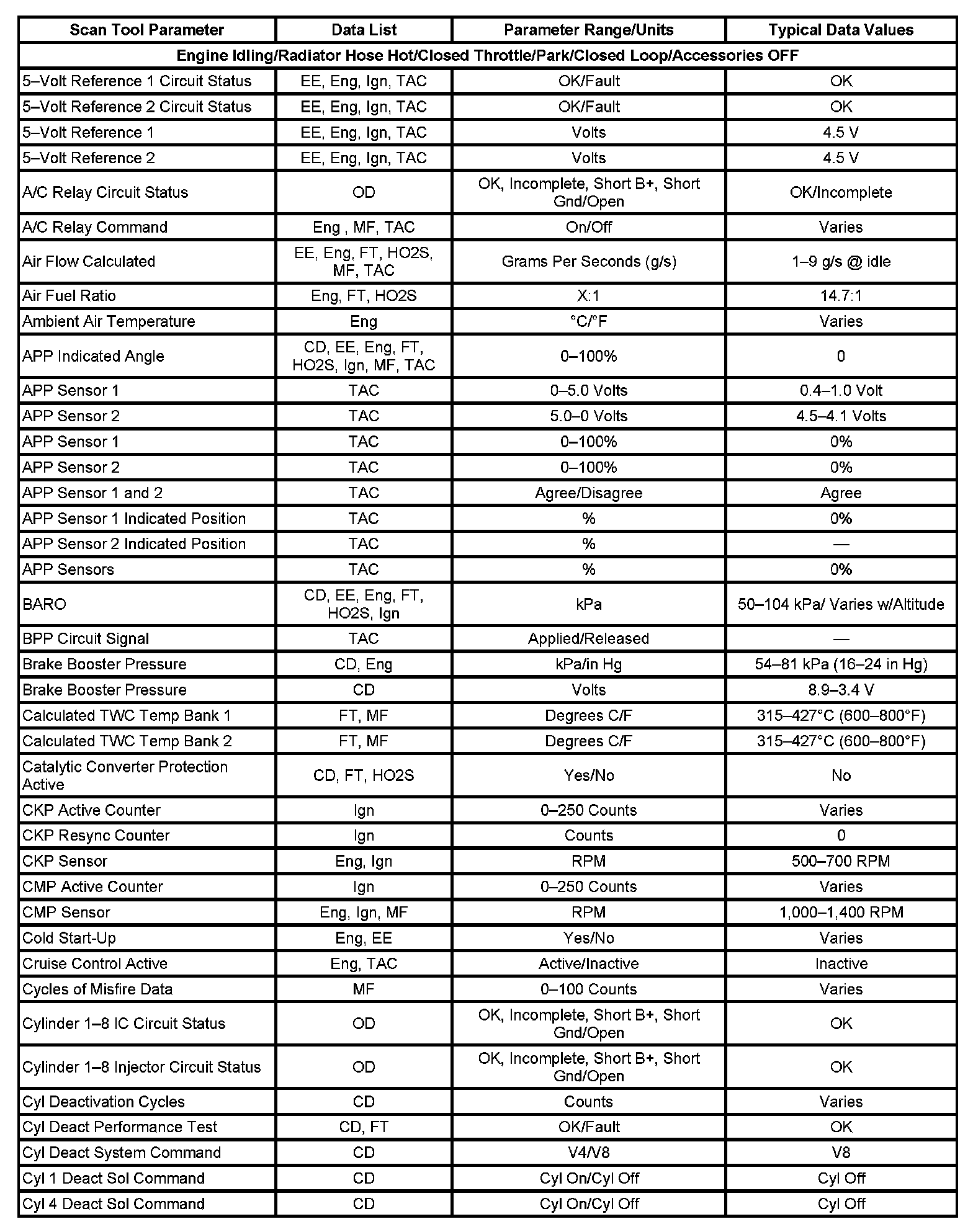 Scan tool values from a properly running engine may be used for comparison with the engine you are diagnosing. The Engine Scan Tool Data List represents values that would be seen on a normal running engine at idle.