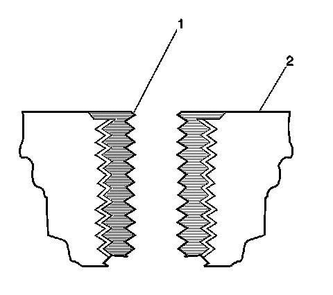 11. Apply threadlock sealant GM P/N 12345493 (Canadian P/N 10953488), J 42385-109, LOCTITE 277� or equivalent (1) to the insert OD threads (2).