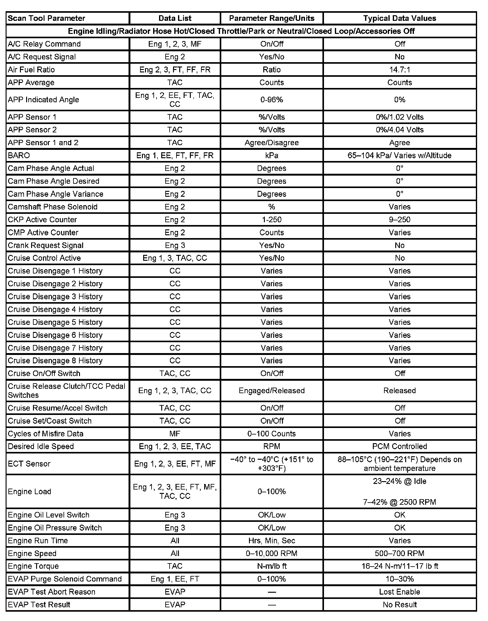The Engine Scan Tool Data List contains all engine related parameters that are available on the scan tool. The list is arranged in alphabetical order. A given parameter may appear in any one of the data lists, and in some cases may appear more than once, or in more than one data list in order to group certain related parameters together.