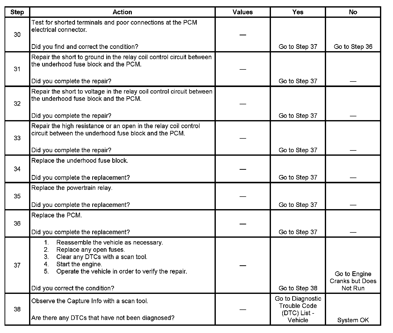 If the powertrain relay fails to close the engine will crank, but will not run. The PCM class 2 communications will be available with the use of a scan tool.