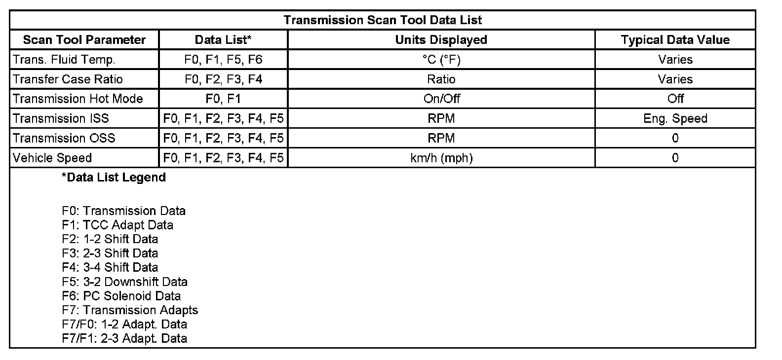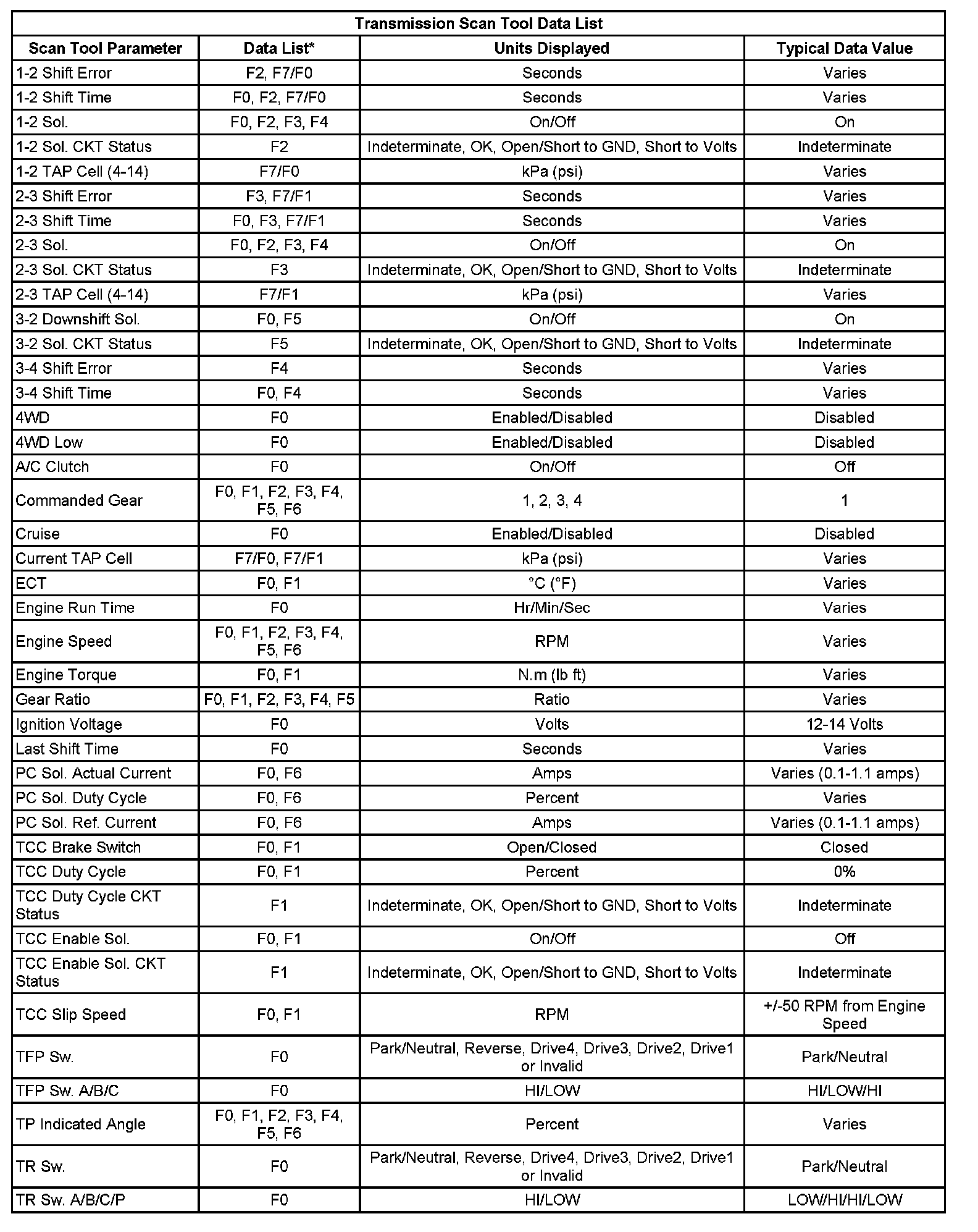 Only the parameters listed below are used in this manual for diagnosing. If a scan tool displays other parameters, the values are not recommended by General Motors for use in diagnosis.