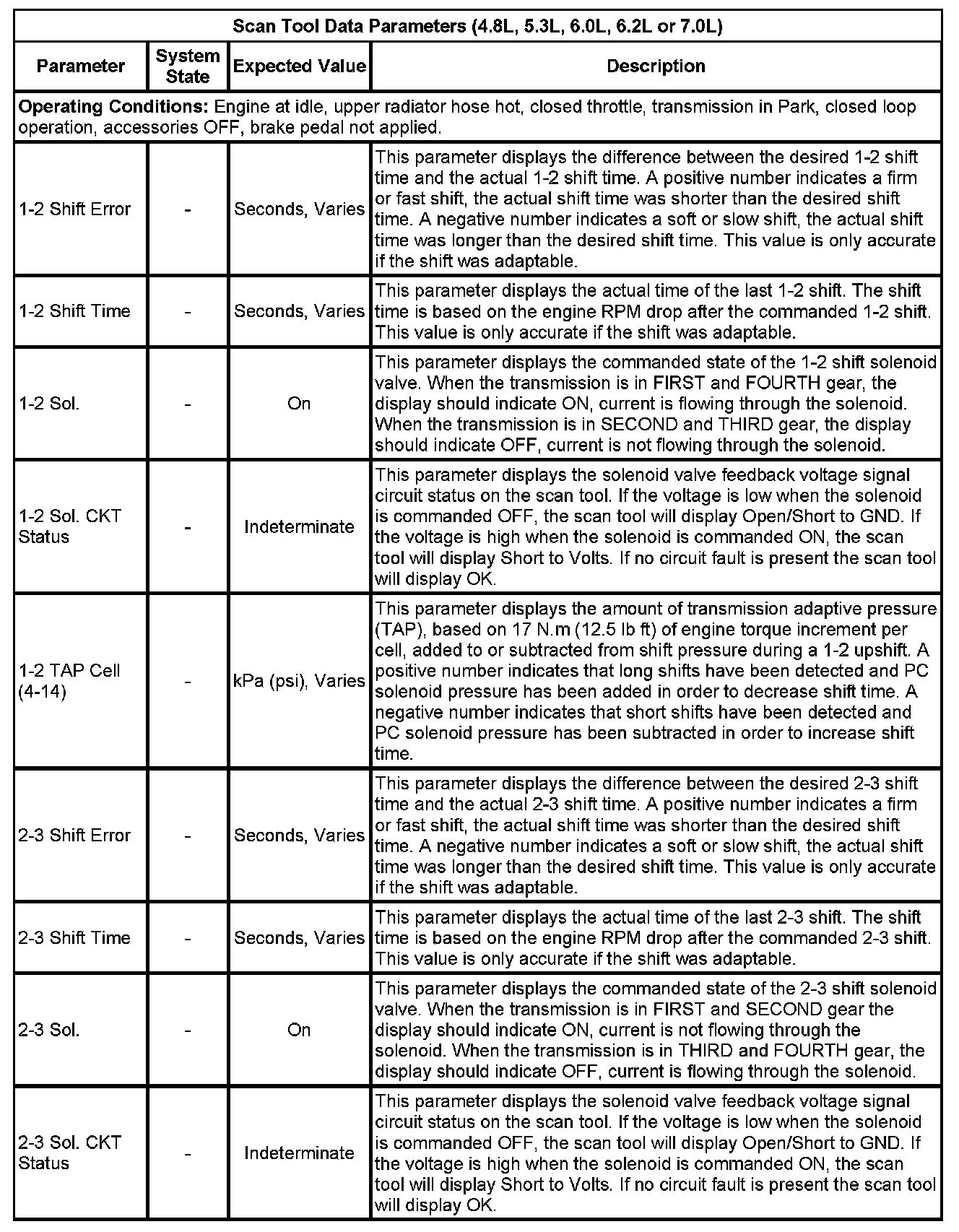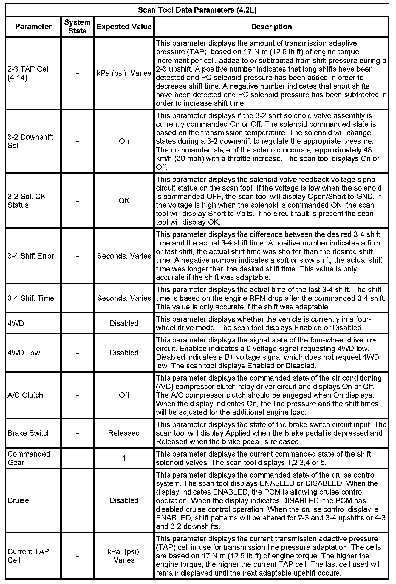 The scan tool values from a properly functioning transmission may be used for comparison with the transmission you are diagnosing. The values below represent a typical display recorded from a properly functioning system.