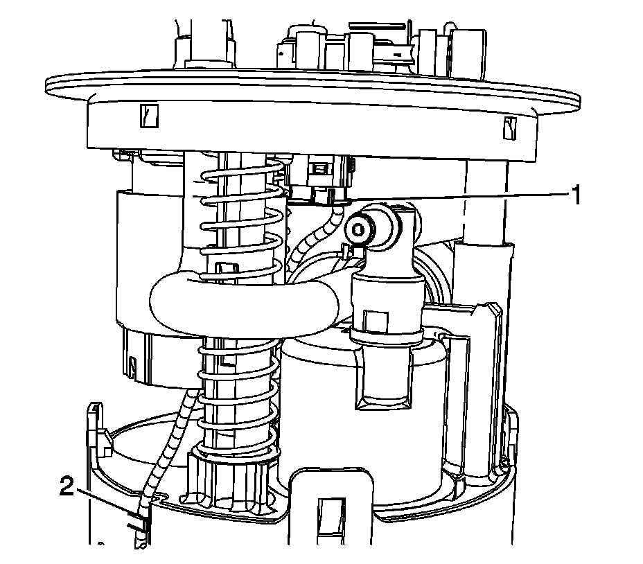 2. Push down the fuel level sensor pigtail electrical connector retainer (1) and remove the connector from the module cover.