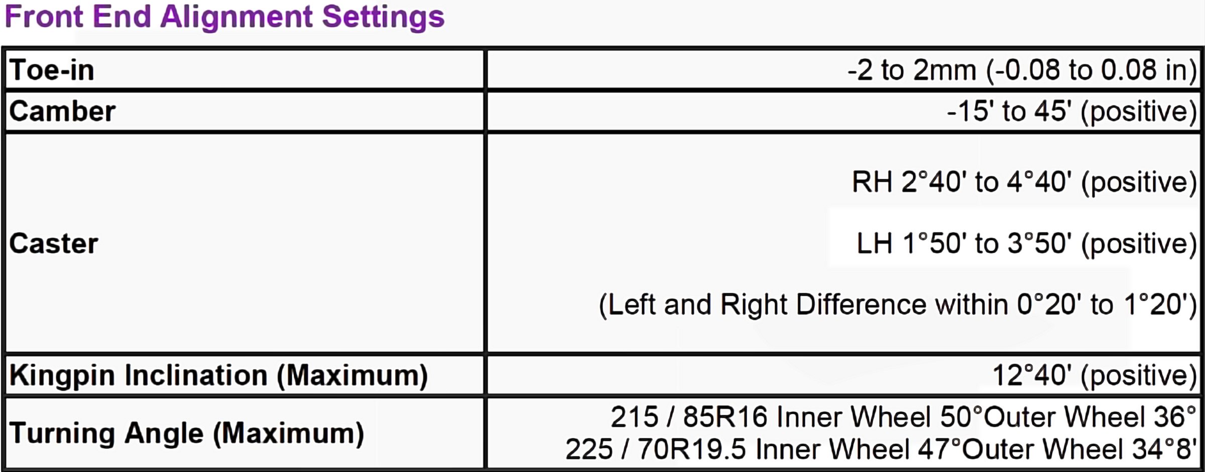 Wheel Alignment Specifications