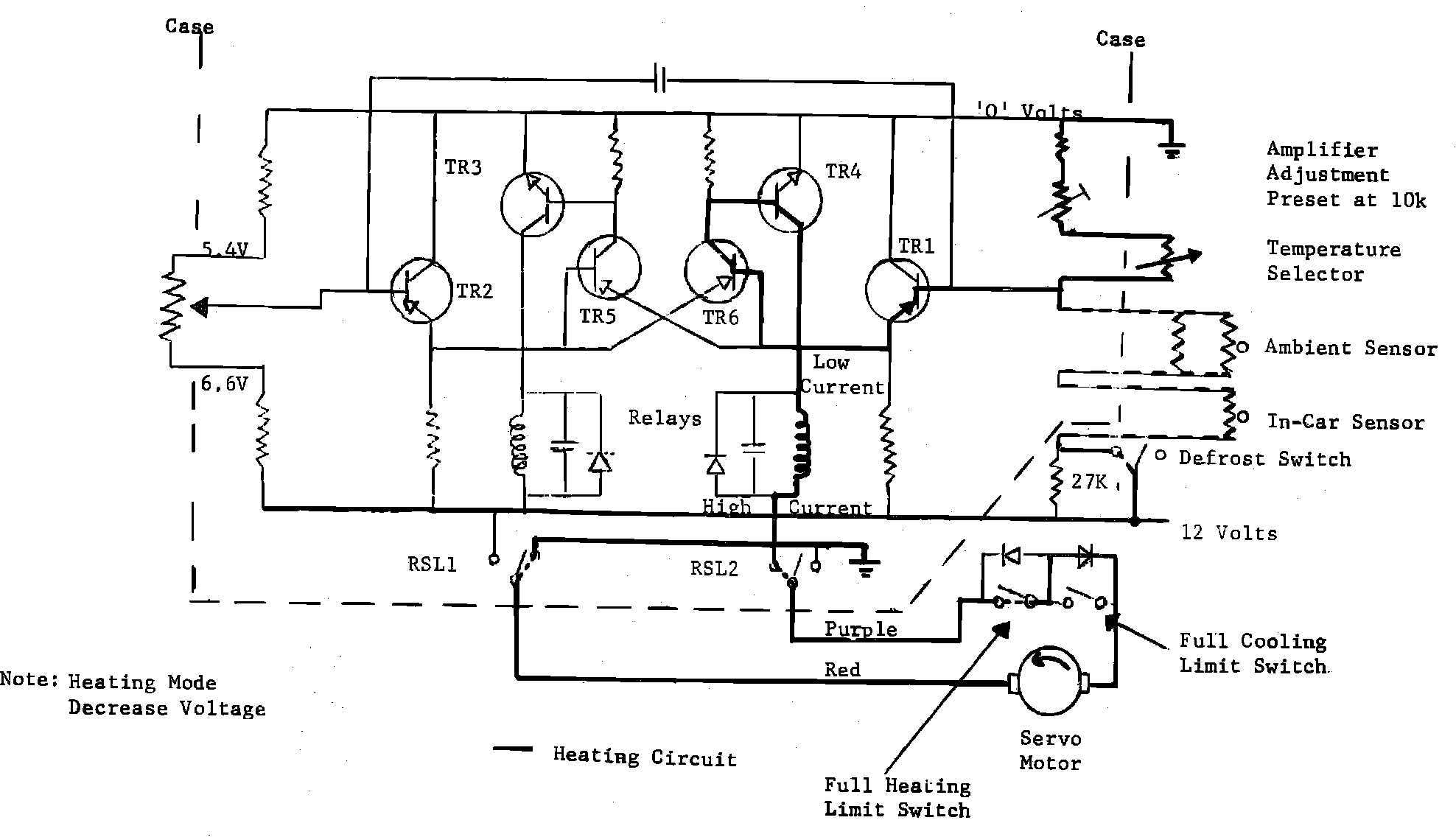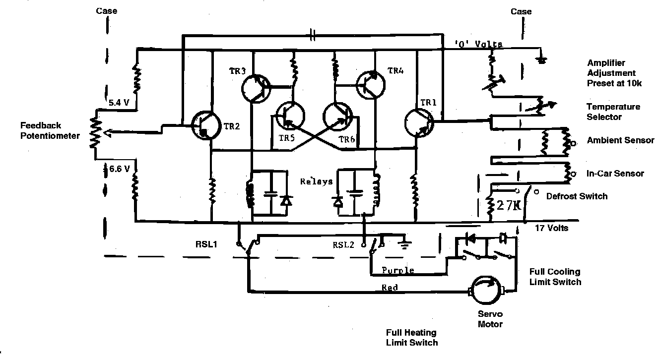 When full heating is selected, the temperature selector is placed at 85. This introduces a resistance into the circuit which raises the current and reduces the voltage. Sensing the lower voltage, the amplifier allows current flow through TR1, TR6 and TR4 which energizes RSL2 which in turn allows current flow through the purple lead and return to ground through the red lead, rotating the motor and hence the camshaft into the heating mode. When the selected temperature is reached, the in-car sensor's resistance changes cancelling the IMBALANCE and allows the feedback potentiometer to return the camshaft to the central position. In full heating, fan speeds are limited to Low and MED 1 (2nd speed) - Depends on Ambient influence.